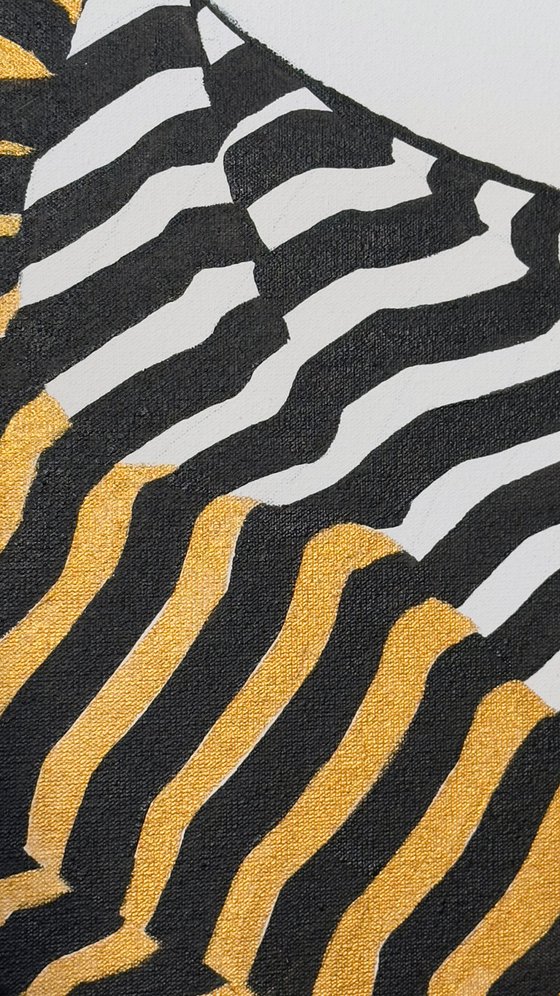“Draped in Elegance” captures a moment of quiet grace and sensuality. This acrylic painting on canvas, enriched with texture paste, presents the back view of a seated nude woman, her form partially wrapped in bold black, white, and gold striped fabric. The contrast between the minimalism of the figure and the dynamic pattern evokes a sense of mystery, strength, and softness. The textured surface adds a tactile depth that enhances the overall experience.