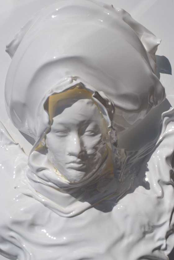 Color; White. The surface of the sculpture is glossy, similar to porcelain.
