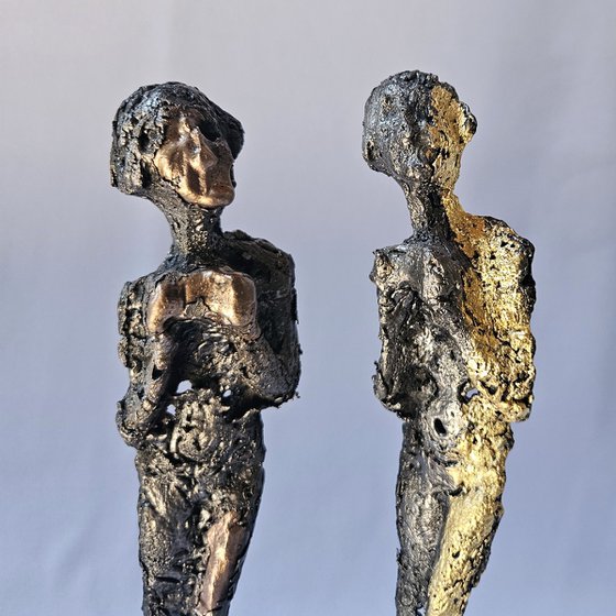 This sculpture captures the intimacy of a silent exchange between two feminine souls, symbols of creation and emotion.
