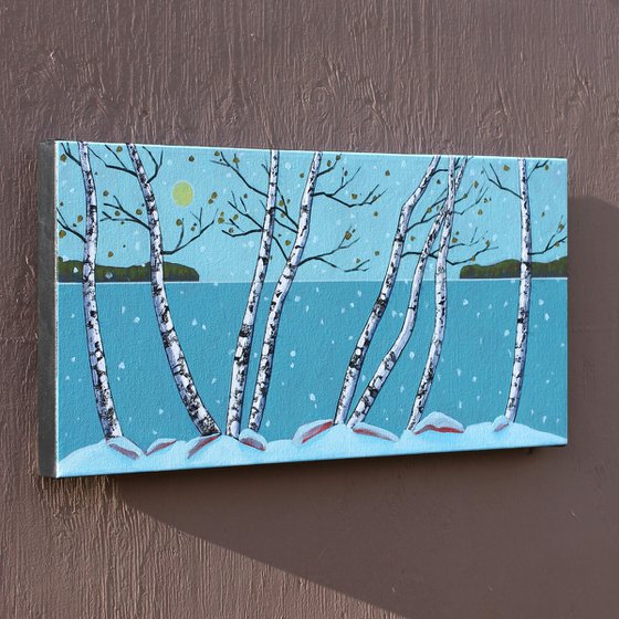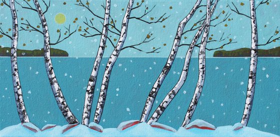 It's an overcast day by the lake, when the light of the sun is hazy, and a blanket of new fallen snow has changed the landscape to look like a page out of a storybook. This is what I've tried to capture here with birch trees on the shore looking out at the grey sea.