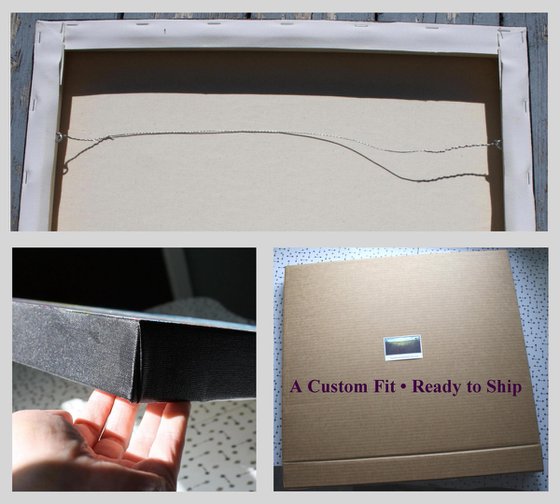 12x24 inches, sides painted black. Wired ready to hang. Protected with a light gloss varnish. Gloss varnish is a low gloss, not super shiny, but some sheen to it. If you prefer a high gloss please message me and I can do that for you.