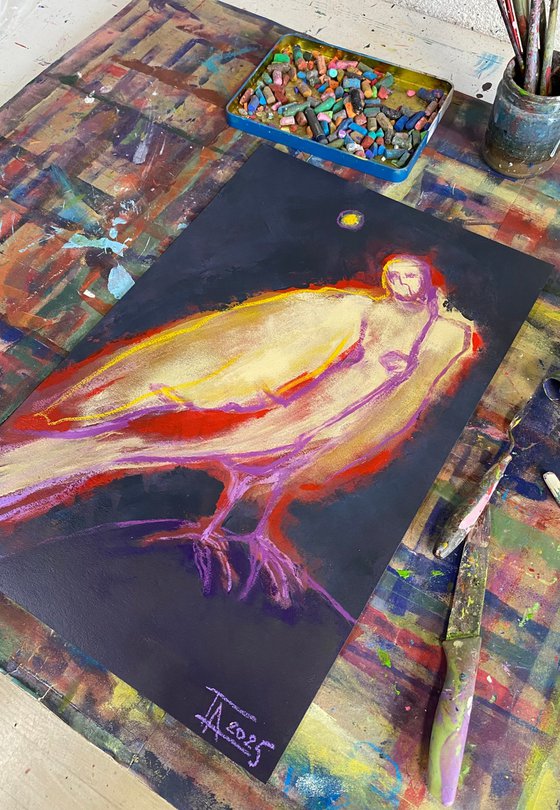 The drawing is done in an expressive manner on cardboard with acrylic paints and oil pastels, covered with matte varnish. If the work is framed with glass, it will be a wonderful interior decoration or a gift to someone dear to you.
