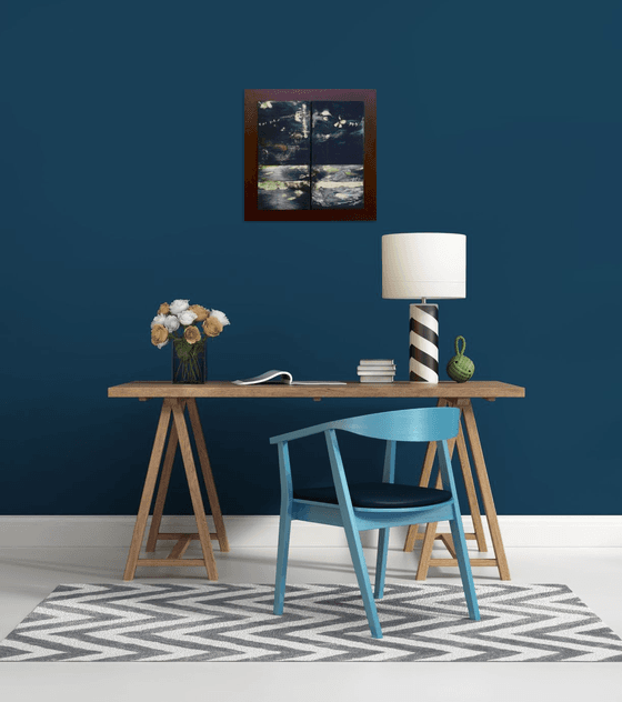 Eolo is a work composed of 2 wooden panels that make up a diptych subsequently mounted on a hand-made frame of Pompeian red color. This dark-toned diptych shows a night landscape with the lights of the stars and the moon that come out of the black background and a seascape shines under this light also thanks to the shiny reflections of the resin. You can see the head of Eolo God of the wind that blows a breeze on this dark night creating invisible threads on which birds lie at rest.