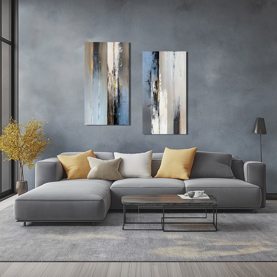 This diptych evokes a sense of stillness and movement at the same time. The vertical lines create an uplifting energy, while the cool palette instills calmness and balance. It invites the viewer to pause, reflect, and immerse themselves in its abstract beauty.