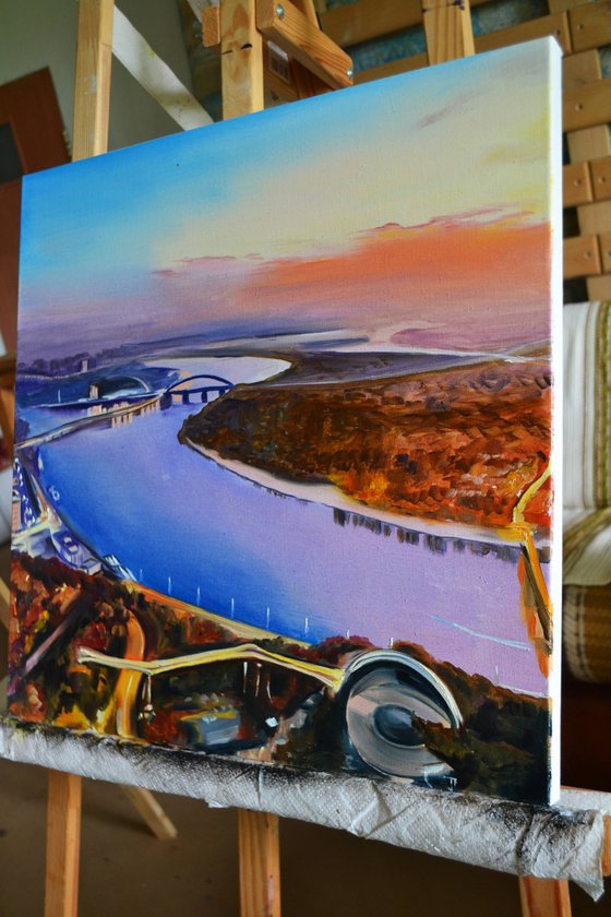 The evening landscape of the capital of Ukraine, Kyiv, from a bird's eye view. The painting in orange, purple, yellow, purple and blue tones depicts the beauty of the sunset over the Dnipro River, which flows through Kyiv.