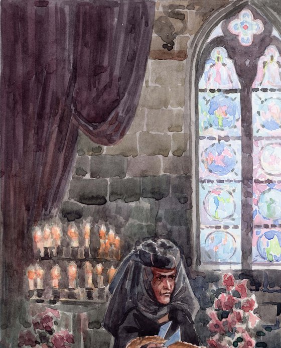 Brothers Grimm fairy tale "Rapunzel". This is the scene from a fairy tale. This is a scene from the fairy tale Rapunzel when the witch cuts off the girl's braid. The girl raised the witch into the tower, where she was imprisoned on a scythe.