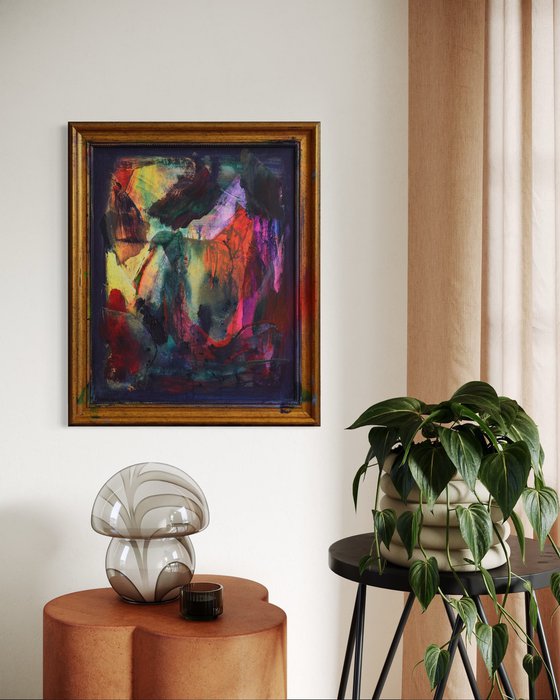 48 x 58 cm, Acrylic, Spray Paint and Ink on HDF board. Framed in a golden wooden frame. The frame is part of the artwork.