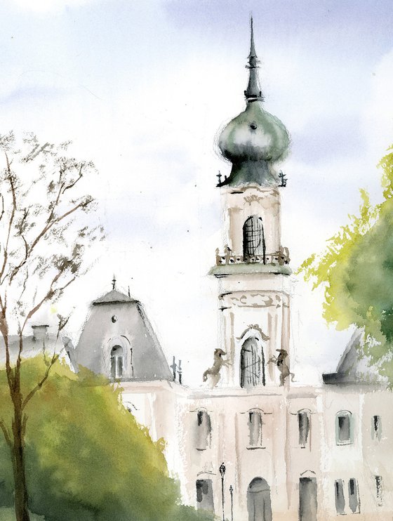 This plein air watercolor captures the majestic baroque architecture of Festetics Palace in Keszthely, Hungary. Painted on location, it features delicate washes, soft sky, and lush greenery, bringing out the timeless elegance of this historic landmark. Created on 11" x 15" high-quality watercolor paper. Unframed.