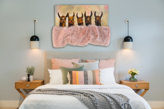 Sometimes I wonder - what if wild animals secretly dream of soft blankets, Netflix nights, and the quiet joy of being home? This painting is my way of answering that: with five cheerful alpacas snuggled up under one fabulously fluffy faux-fur blanket. Each of them has its own personality - one sticks out their tongue, another grins mischievously - but together, they radiate warmth and playfulness.