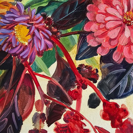 Created from a colorful bouquet gathered in my grandmother’s garden and inspired by the diverse flora of a summer garden, this piece captures both the harmony and the wild beauty of the natural palette.