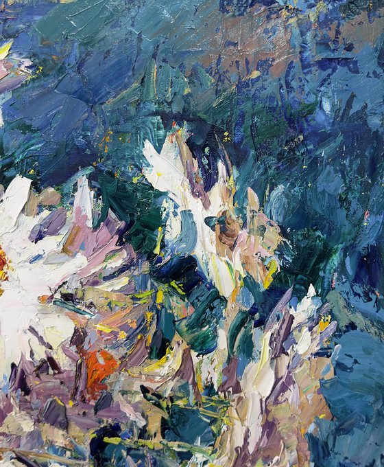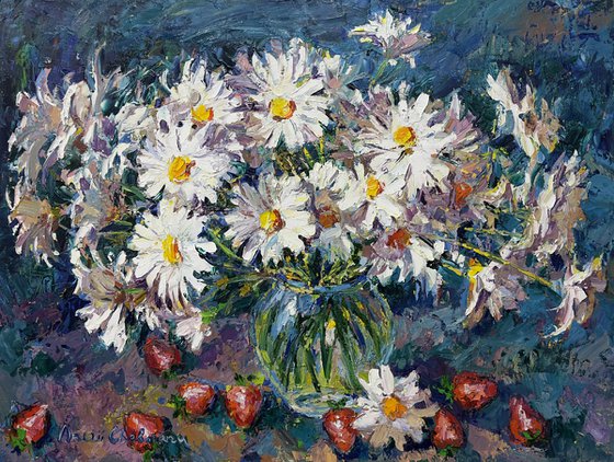 “Flowers for you” is a joyful impressionist still life featuring a wild bouquet of daisies and scattered strawberries. Painted with expressive palette knife strokes, this vibrant oil on canvas radiates summer light, tenderness, and warmth. The composition captures a sense of spontaneity and sincerity — a heartfelt gesture frozen in color. A perfect piece to brighten any space with charm and emotion.