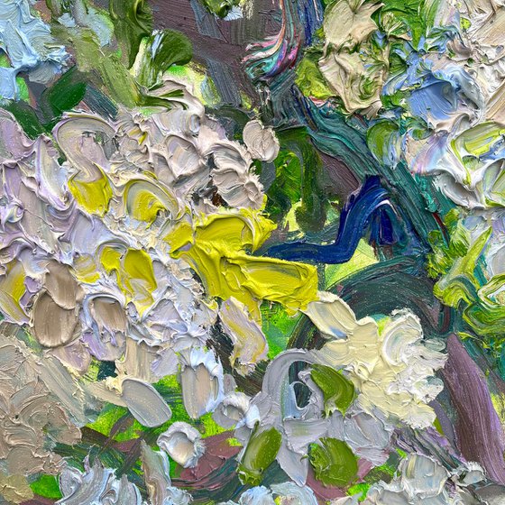 The artist captured a white garden filled with blooming cherry trees. The branches of the trees are covered with a thick layer of snow-white flowers, giving the impression of fairy-tale magic. The soft greenery of the young grass only highlights the contrast between the bright white colors and the muted green hues of the environment.