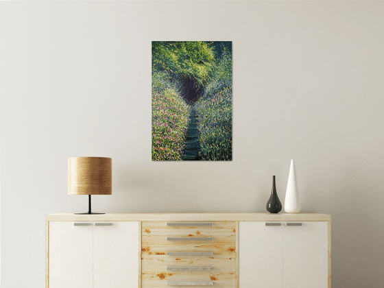 A contemporary impressionist painting of a forest path with wild flowers, painted in a mix of seasonal colours, and created in my signature style, which utilises a range of textures, tools and painting implements to create a unique visual effect.