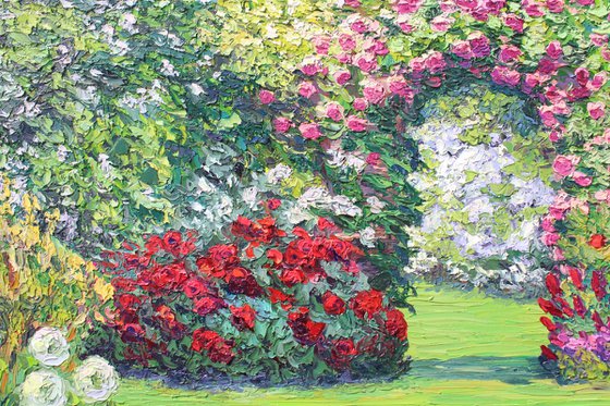 An original 36" x 30" or 91.44cm x 76.2cm, floral garden landscape painting of climbing roses and other flowers in a French style garden. Colorful strokes of thick paint bring this garden to life. You will never get tired of looking at this refreshing, contemporary painting.