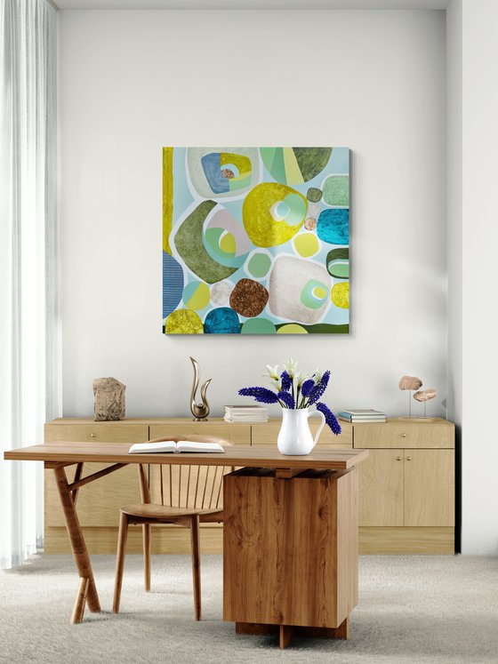 Add a touch of elegance and modernity to your home with this charming abstract painting. Made on high-quality canvas, this artwork expertly combines geometric shapes and a vibrant color palette ranging from green to yellow, from blue to beige to brown.