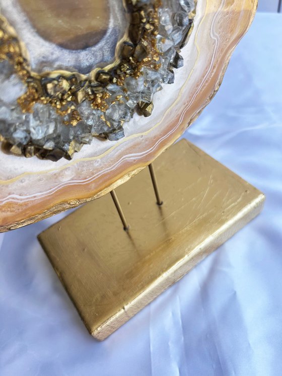 A slice of natural yellow agate, encased in a circle of broken glass with the addition of glitter, alcohol ink and epoxy resin, creates a unique work of art that reflects the beauty of natural materials and celebrates the creation of the depths of our planet. Light passing through the amethyst gives a new look on each side. The sculpture stands securely on stainless steel metal legs screwed into a solid piece of very durable wood called Ipe, Brazil walnut. The size of natural amethyst is 10 by 11 cm.