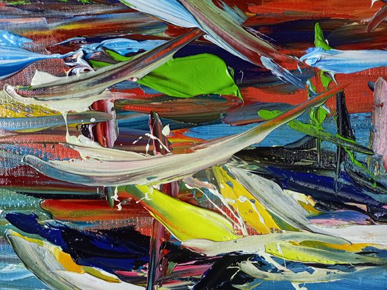 The white frame that embraces the work lends a touch of elegance and allows the painting to stand out as the focal point of any exhibition space. "Yellow and Boats" is an attention-grabbing work of art that evokes deep emotions, making it a magnificent addition to any art collection. The skillful use of colors and shapes makes this canvas a valuable investment, both aesthetically and financially.