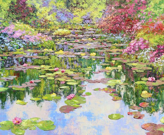 An original contemporary, impressionist oil painting on canvas that depicts Monet's garden pond at Giverny, France.