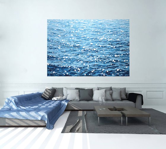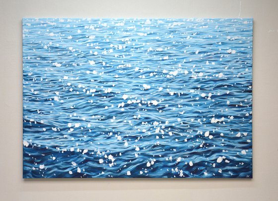 In this acrylic painting, I sought to capture the mesmerizing interplay of light on water, employing an impressionistic touch while grounding the work in realism. Each brushstroke embodies the fleeting glow of sunlight dancing across the gentle undulations of the sea, invigorating the blue depths with bursts of bright, sparkling whites. This piece is designed to evoke a sense of calm and wonder, bringing the serene yet dynamic energy of the ocean into your living space. Used high quality materials. Acrylic painting on canvas. It is varnished. The artist's signature, the sides are painted in the color of the painting. Ready to hang. Certificate of Authenticity.