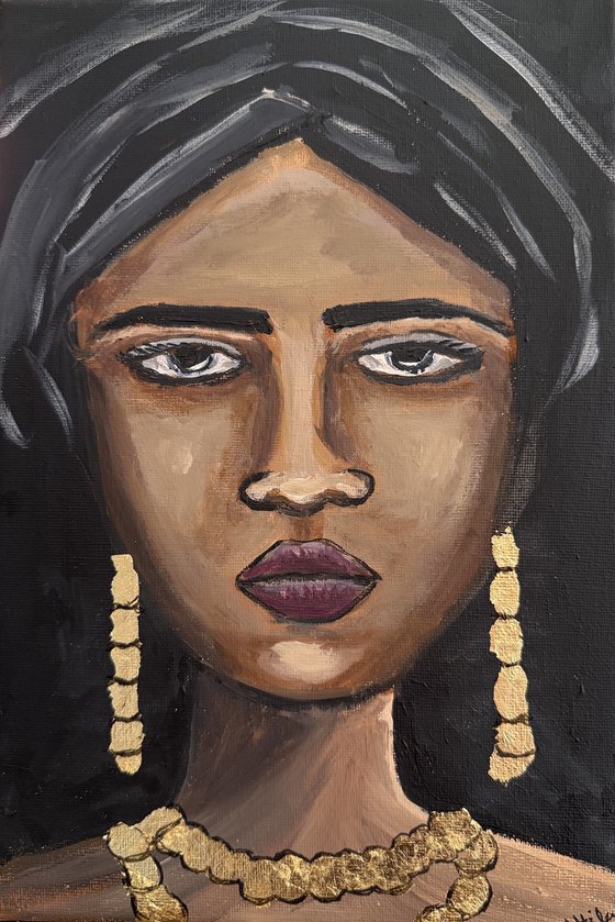 An elegant woman adorned with golden jewellery evokes confidence. The jewellery is created with gold leaf which shimmers when light is reflected off at a certain angle. This painting has been varnished with gloss for protections, signed by the artist, wired at the back for hanging onto the wall. This painting will be carefully packed into a custom made box and delivered within two working days by a tracked courier service. Also comes with a certificate of authenticity.