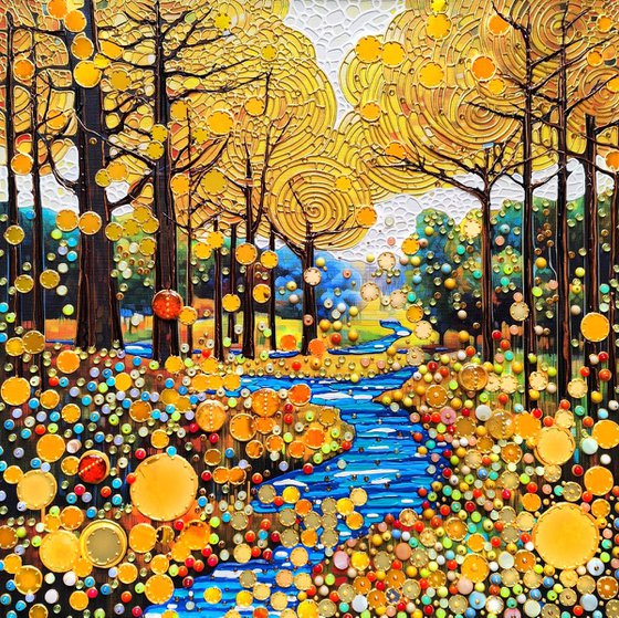 Original abstract landscape painting, textured wall art, contemporary canvas landscape art, unique handmade landscape painting, modern abstract wall decor, landscape painting for living room, forest art for office space, nature inspired artwork, summer landscape, landscape, klimt, forest, trees, abstract landscape, golden painting, sunset, sunrise, sun reflections, sun lights, modern landscape, contemporary landscape, forest stream, mosaic art