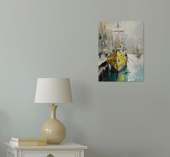 In this captivating harbor scene, a bold yellow ship anchors in the misty stillness of an early morning port. The artist masterfully balances palette knife texture with moody atmosphere, allowing the vibrant hull to emerge as a beacon of presence amid a silvery haze. The reflections in the rippling teal water lend a sense of depth and realism, contrasting the abstraction of the fog-shrouded background. This evocative marine painting speaks of waiting, journeying, and the quiet solitude found in transitional spaces—perfect for collectors drawn to nautical themes and impressionist drama.