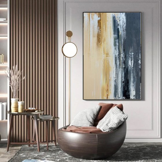 Golden Drift is an original abstract landscape from my contemporary series, evoking the meditative stillness of a horizon kissed by light. This large canvas (100 x 80 cm) is painted with rich acrylic layers using palette knife and textured brushstrokes, blending golden beige, warm ochre, soft ivory, deep navy, and smoky grey tones. The luminous upper portion transitions into a layered ocean-like base, creating a peaceful and elegant balance between warmth and depth.