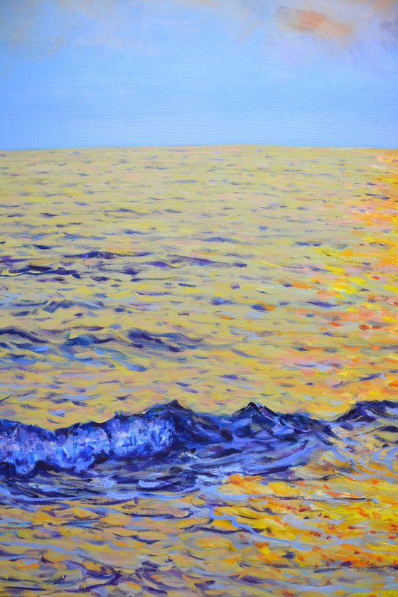 In creating this painting, I sought to capture the fleeting, ethereal beauty of a sunset over the ocean. The golden hues, warmly caressing the undulating waves, reflect life's transient, yet timeless moments. Utilizing oils, I blended impressionism with realism to evoke a sense of peace and contemplation. This artwork, resonating with serene energy, will bring a harmonious balance and a whisper of nature's majesty into any home. The painting contains high-quality materials, it is varnished, the sides are painted in the color of the painting, ready for suspension, a signed certificate of authenticity.