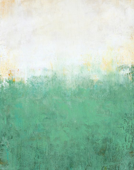 Green Field 250501 is a modern bright landscape painting created with palette knives and non traditional tools. This painting has nice greens and fresh whites.