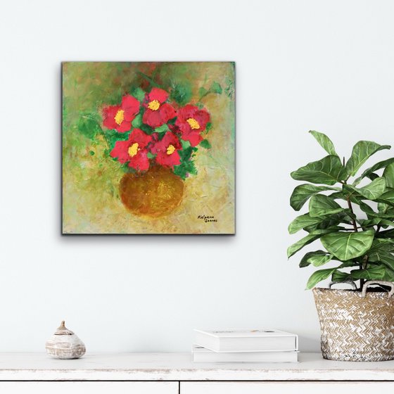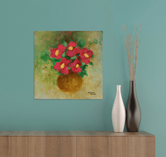 Hope, a spring floral artwork with vibrant pink flowers. In bright pink, yellow and green, this lovely painting will brighten up the wall. The sides of the canvas are finished in black. Ready to hang. No frame required. This original painting will be delivered with a Certificate of Authenticity signed by the artist.