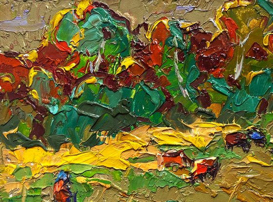 This oil painting cardboard, titled "In the Field on a walk", the painting radiates warmth and tranquility, transporting the viewer into a golden pastoral landscape where nature and human presence coexist in harmony. In the foreground, the sunlit field is painted in warm shades of ochre, yellow, and green, evoking the golden glow of late afternoon. The textured brushwork suggests the uneven, natural terrain, where patches of grass and soil create a rich tapestry of earthy tones. The thick application of paint gives a tactile, almost sculptural quality to the landscape, enhancing the sense of depth and realism. Scattered throughout the field, a small herd of grazing cows, painted in deep reds, browns, and blues, adds movement and life to the composition. The animals, depicted with quick, energetic strokes, appear to be lazily wandering, further reinforcing the scene’s relaxed and peaceful atmosphere. To the left, a lone figure dressed in blue walks through the field, seemingly observing the cattle or simply enjoying a stroll. The simplified form of the figure, rendered with minimal yet expressive brushstrokes, adds a human element to the scene, evoking a sense of solitude and connection with nature. The middle ground features a dense line of trees painted in deep greens, fiery oranges, and warm reds, suggesting an autumnal transition. The foliage, created with thick impasto strokes, appears to shimmer with the changing season’s light, adding a striking contrast to the golden hues of the field. The background consists of a soft, muted sky with hints of ochre and gray, blending seamlessly with the rich tones of the landscape. The subdued colors of the sky allow the vibrant foreground and trees to stand out, reinforcing the depth and perspective of the painting. The painting captures a fleeting yet timeless moment of rural life, where the beauty of open fields, grazing animals, and a solitary figure walking through the countryside come together in perfect harmony. Through expressive brushwork and a masterful use of color, the artist invites the viewer to step into this tranquil scene and experience the serenity of a walk in the golden fields.