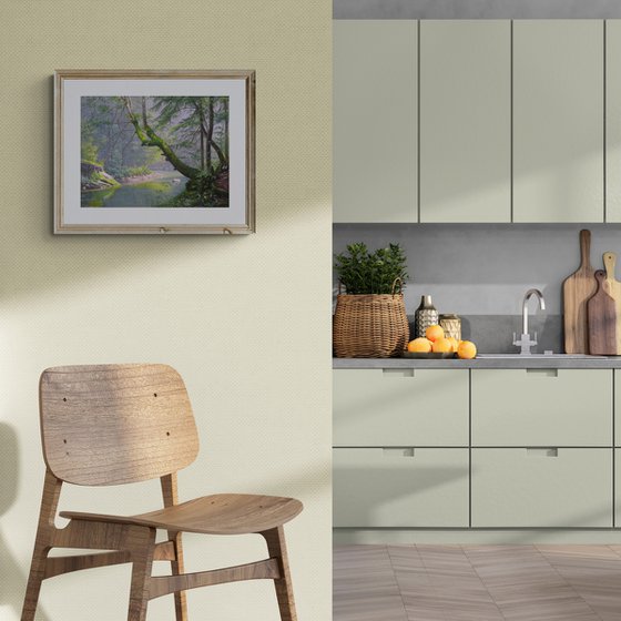 In crafting this oil painting, I strove to capture the tranquil harmony of nature, marrying impressionistic nuances with realistic detail. Each brushstroke evokes the lushness of verdant foliage and the serene flow of the river, elements that invite the onlooker to immerse themselves in a timeless sanctuary. The energy of this piece radiates a calming presence, beckoning one to embrace the serenity within their own space.