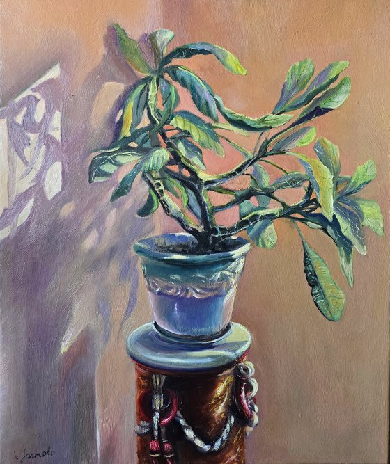 This mesmerizing still life captures a potted plant basking in golden sunlight, its lush green leaves glowing with life. The intricate play of shadows on the wall creates a rhythmic dance of light and form, while the warm, earthy tones of the background evoke a sense of serenity and timeless beauty. The ornate pot, resting on a richly detailed pedestal adorned with braided accents, adds a touch of elegance and texture.