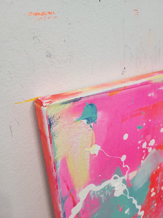 MATERIALS: acrylic, lacquer, ink, oil, spray on canvas. Some of the colors used in the painting are fluorescent (especially orange and pink). They glow under ultraviolet light. Every painting contains only top quality materials.