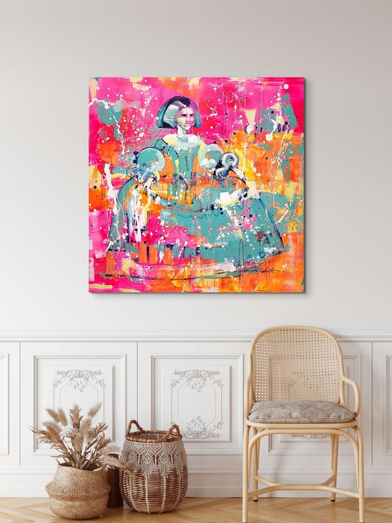Inspiration for "Infanta in Pink" was Diego Velázquez's original work and an exploration of new creative depths. Rose dance gracefully upon the canvas, emanating an aura of pure elegance and serenity. It is an invitation to see the world through the eyes of a child once more, embracing the wonder and curiosity that often fade with age.