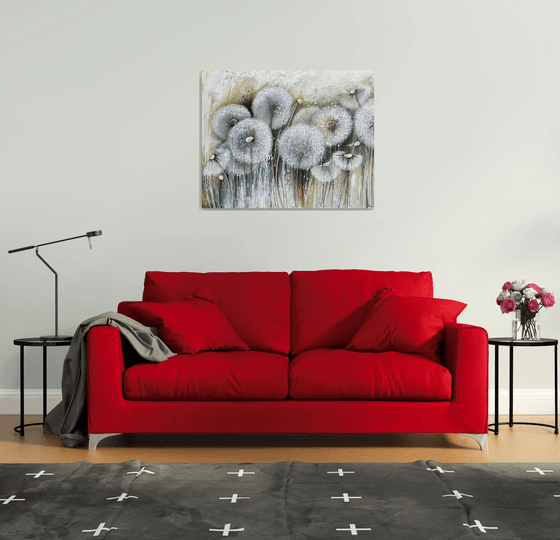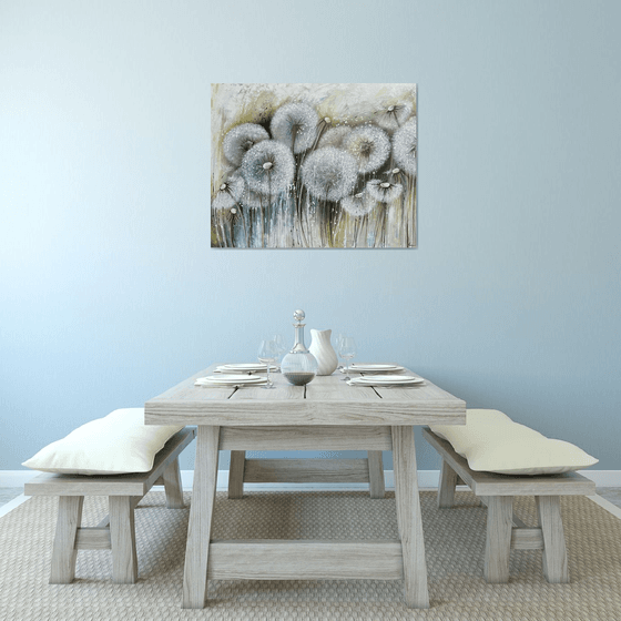"Into the Lightness" captures the delicate, fleeting magic of dandelions at the moment they surrender to the wind. Painted in soft, ethereal tones of ivory, sage, and misty gold, the composition radiates calm and quiet wonder. Each seed head is rendered with fine detail, giving a tactile, almost dreamlike quality to their soft textures. The background flows with gentle movement, suggesting a breeze or a passing thought. This elegant large-format painting invites reflection and a sense of freedom, symbolizing release, hope, and the beauty of impermanence. An ideal statement piece for serene, nature-inspired interiors.