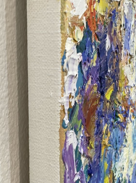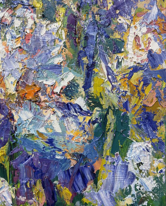 “Irises” is an expressive impressionist oil painting filled with color, texture, and emotion. Painted with palette knife strokes, it captures the vibrant energy of blooming irises in a wild, natural composition. Layers of violet, white, yellow, and green blend into a rich floral tapestry, evoking the essence of a garden in full bloom. A perfect piece for flower lovers and art collectors seeking bold, joyful beauty.