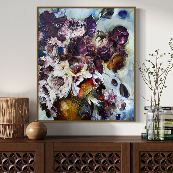 I use only high quality oil paints and linen canvas. This artwork is sold unframed on a wooden frame (stretched canvas), the sides of the canvas are painted, so the artwork is ready to hang.