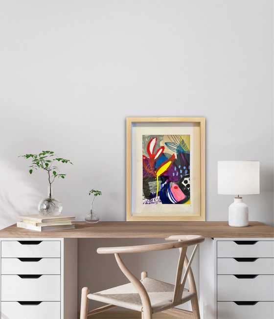 This vibrant abstract artwork bursts with joyful energy and playful contrasts. Painted in dynamic brushstrokes, the composition invites the viewer to explore a world of bold color, spontaneity, and emotional freedom. The piece is rich with details — layers of expressive lines, lush shapes, and luminous tones that evoke feelings of curiosity and vitality. Perfect for brightening a modern interior or adding a touch of lively sophistication.