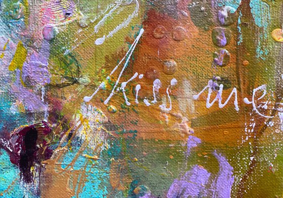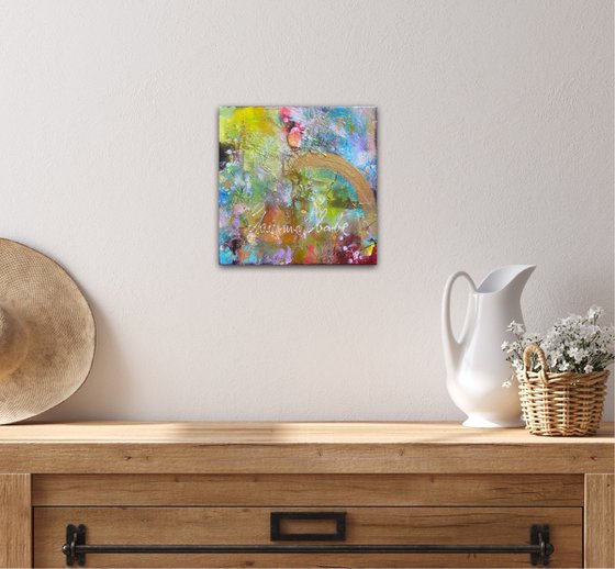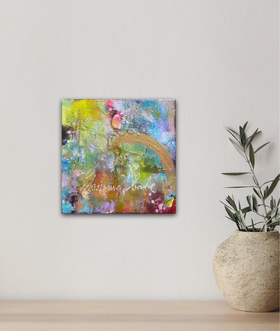 The painting has plenty of layers, is painted with high quality acrylics, 30cm h x 30cm w, and 4 cm deep, edges painted in a dark warm berry red.