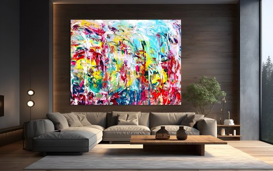 This work is painted on professional-grade canvas and has been sealed with varnish. The canvas has dimensions is 198.1 cm in width by 152.4 cm in height.