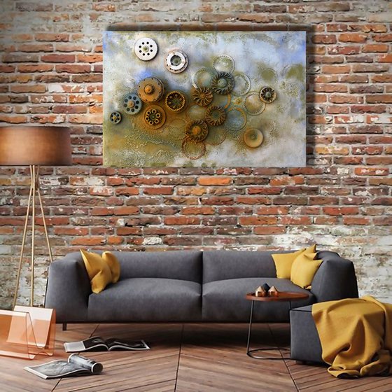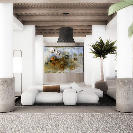 In this series of works "the debris" left by the passage of man speak to us. They are poetic stories. In some works these debris are rust grooves or accumulations of scrap, in others they are objects or strips of fabric and Milena dialogues with these, reconstructing a story.