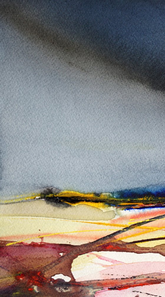 This is abstract watercolor painting 9x12in (~22x30cm) done with watercolor paints on arches paper (140 lb); the painting requires framing. I call it Landscape 21-5.