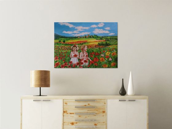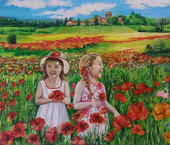 I created this work with great passion, using oil to capture the purity and innocence of the subjects in the context of a serene and flowery landscape. It portrays the essence of joy and simplicity, inspired by natural beauty. Each trait reflects happiness and inner peace, creating an atmosphere of warmth and positivity in the home environment. signed on the front and also colored on the edges, it can also be hung without a frame - it ships anywhere with a certificate of authenticity and professional packaging