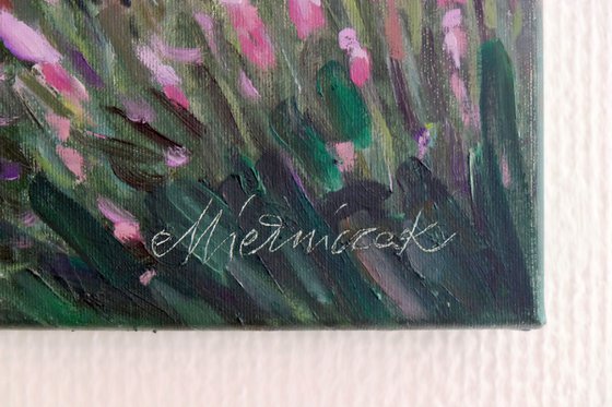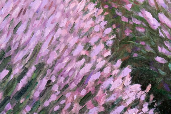 The painting depicts endless fields of lavender in the picturesque area of Valensole in Provence. The main color of the painting is a breathtaking violet, which dominates the vastness of the lavender fields. Majestic mountains rise on the horizon, their contours blurring in the distance. They form a tranquil backdrop for the foreground of the painting. The sky above this scene is streaked with dark storm clouds, painted in various shades of gray and blue. The landscape is moistened by a gentle shower of rain that can be seen in the distance. The scent of lavender, rosemary, fresh hay and other herbs literally rises from the picture and mingles with the vivid depiction of nature. The scenery radiates an atmosphere of calm and freshness, while at the same time the energy of the approaching thunderstorm is palpable.