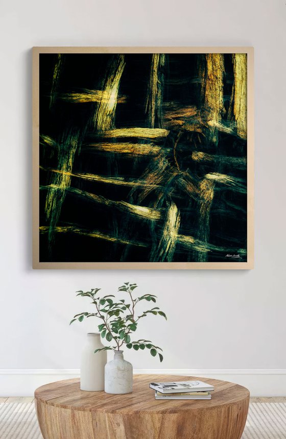 A raw, visceral tapestry of organic energy, Lifeblood #25 (from the Lifeblood project) plunges the viewer into a labyrinth of fractured textures and primal rhythms. Rough-hewn linesโresembling ancient fibers, roots, or veinsโinterweave across a dark abyss, glowing faintly with hues of gold, amber, and moss.
