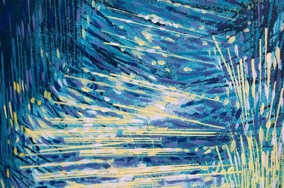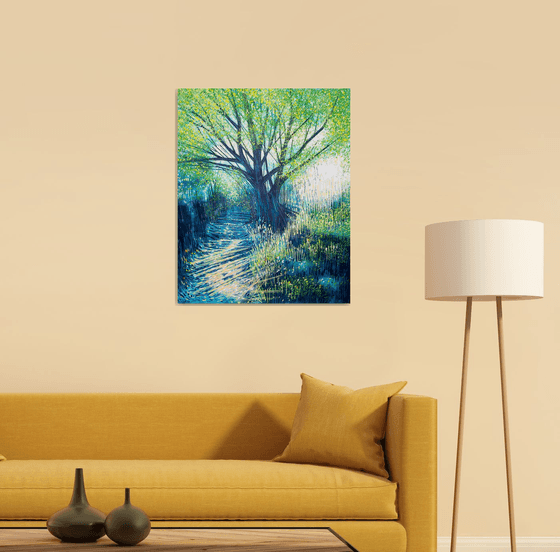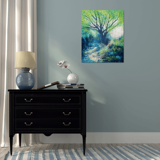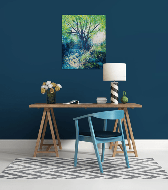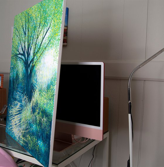 A contemporary impressionist painting of light through Summer trees, painted in a mix of seasonal colours, and created in my signature style, which utilises a range of textures, tools and painting implements to create a unique visual effect.
