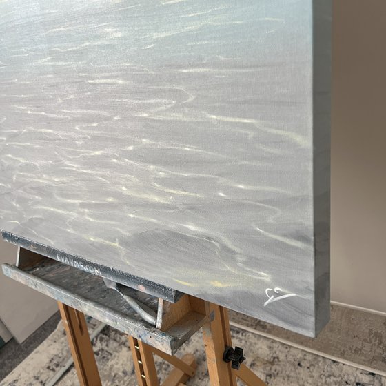This oil painting captures the blissful feeling of weightlessness and well-being when warm crystal clear salty water supports you. It was inspired by my recent snorkeling experience in Turks and Caicos, and is painted in oils on 1.5 inches deep gallery wrapped canvas 36×36 inches. This painting symbolizes clarity and calmness, inviting us to dive into soothing tranquility and depth of ocean blues.