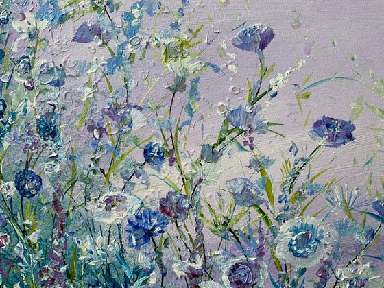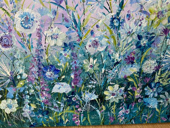 A semi abstract, expressive floral meadow with a lilac and blue base colour. It’s such a challenge for me to paint with restraint on colour as I love wild vibrant colours and pattern. So on this occasion I’m working on restricting my palette and seeing how it turns out..