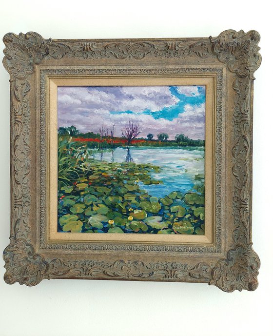 A summer trip canoeing on the river Bure in Norfolk inspired this painting. The lush green waterlilies with their little yellow flowers grow in abundance along the edge of this beautiful tranquil water way. As an artist deeply moved by nature's tranquility, I used my brushes to dance across the canvas, capturing a serene waterscape where lush greenery and waterlilies come alive under a dynamic sky. This work is an ode to nature's quiet beauty, inviting you to bask in the calm it promises to infuse in your space.